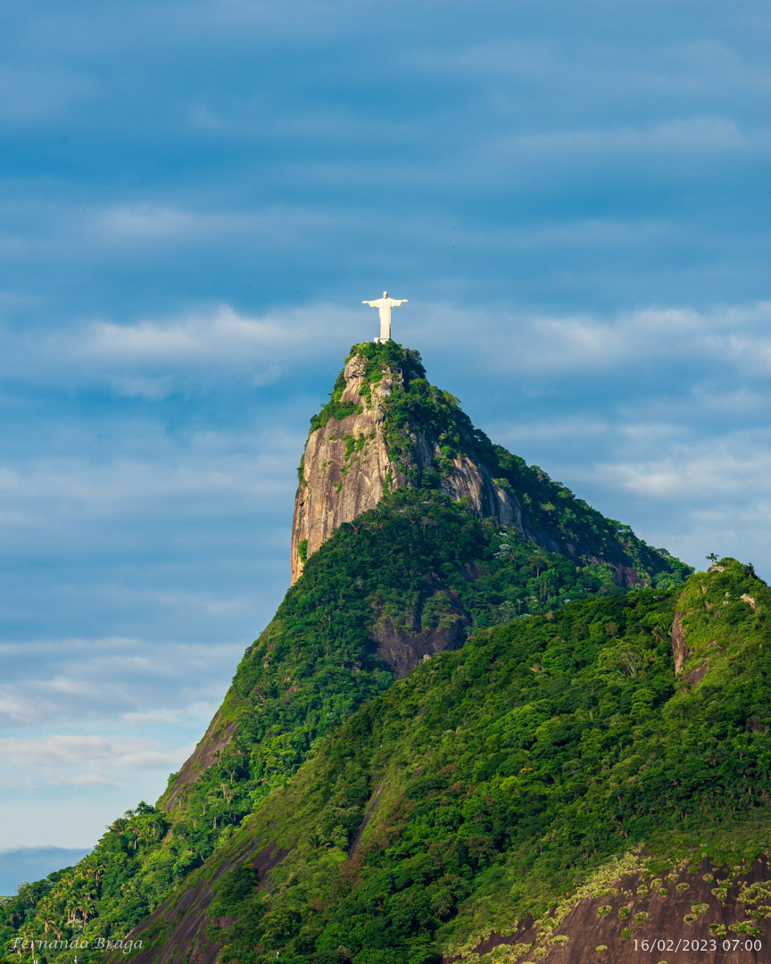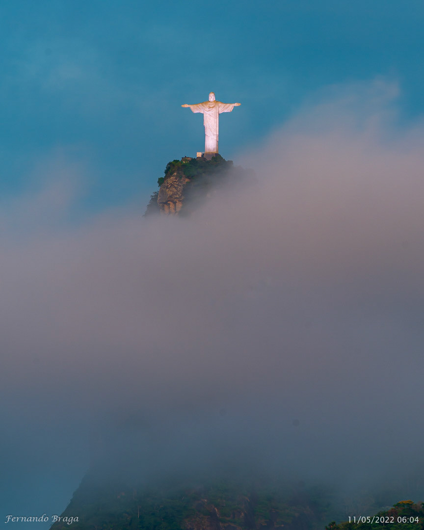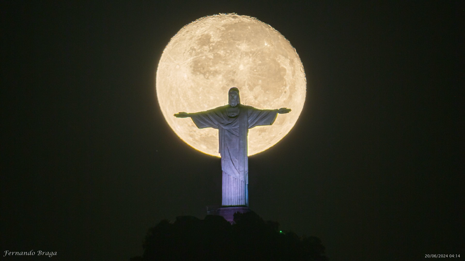 Um encontro celestial entre o planeta Vênus, a Lua Crescente e o Cristo Redentor.