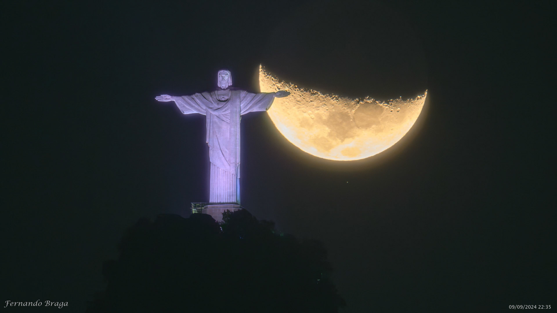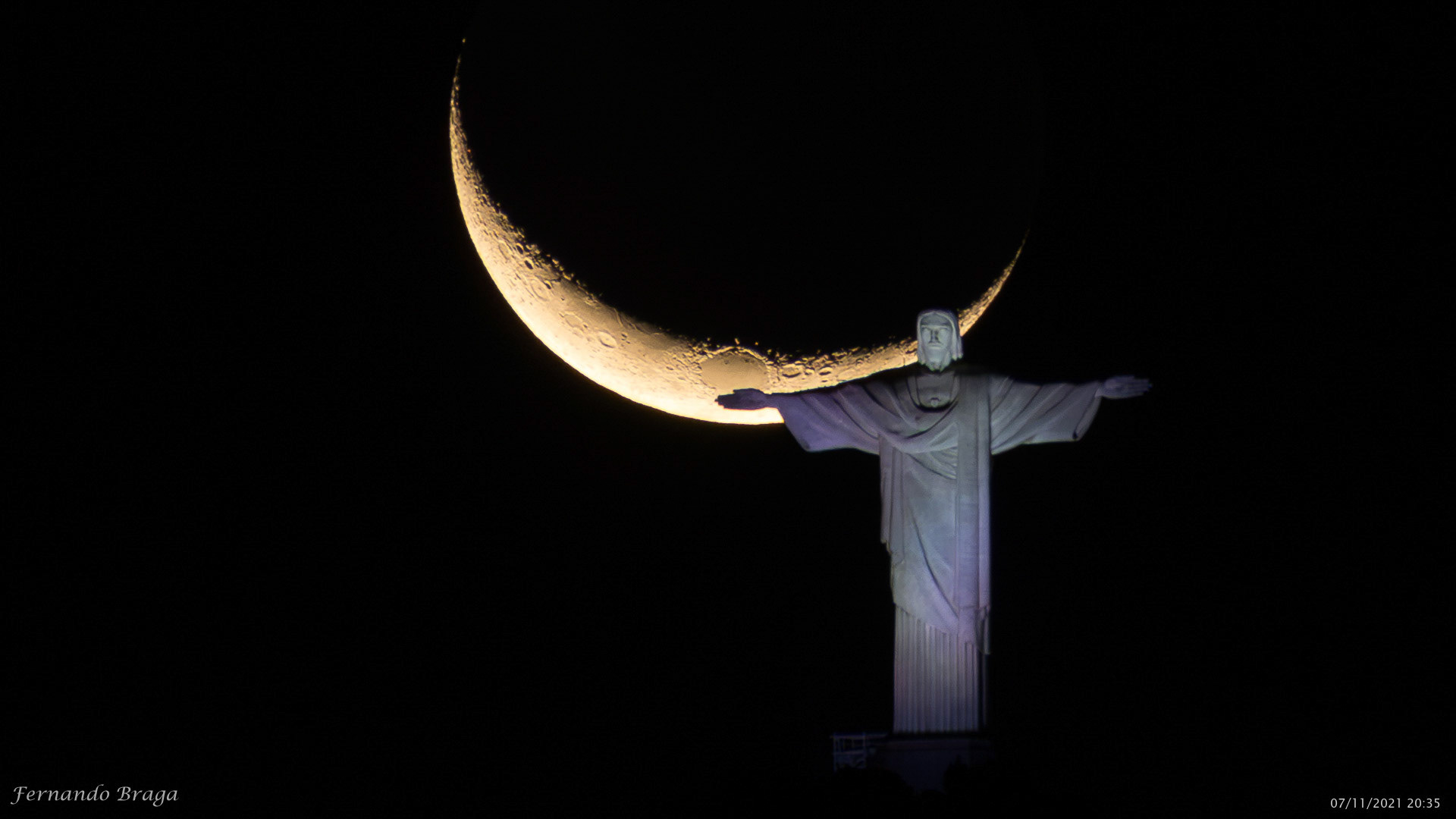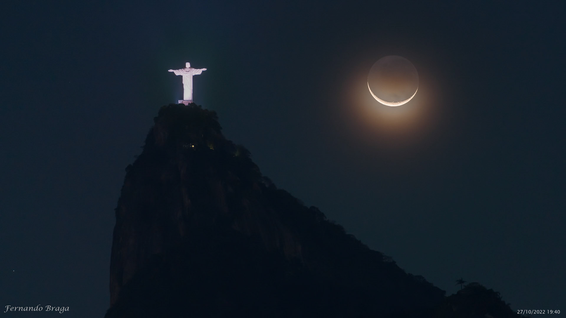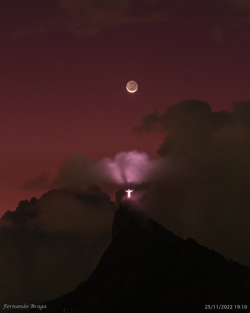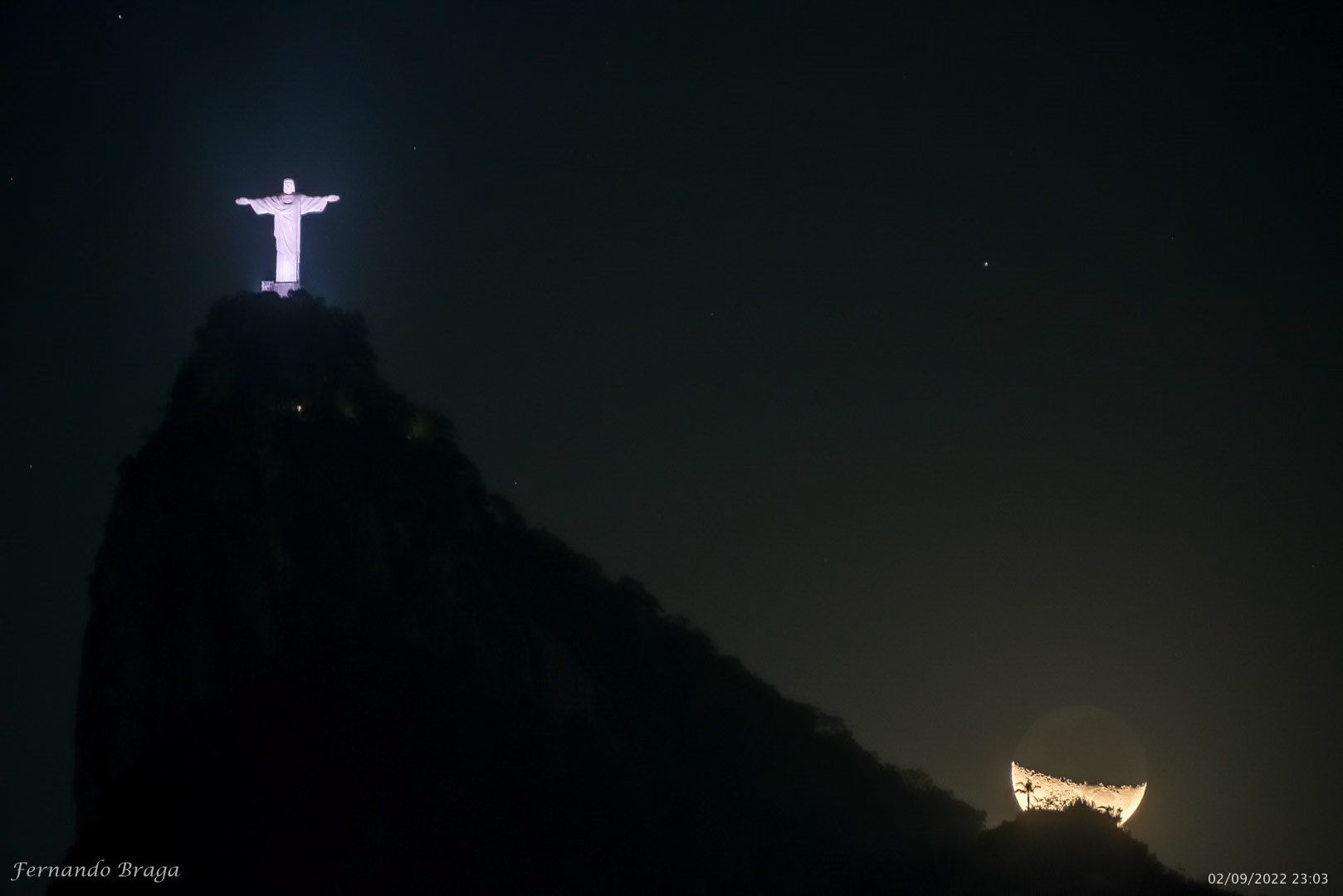 Um encontro celestial entre o planeta Vênus, a Lua Crescente e o Cristo Redentor.