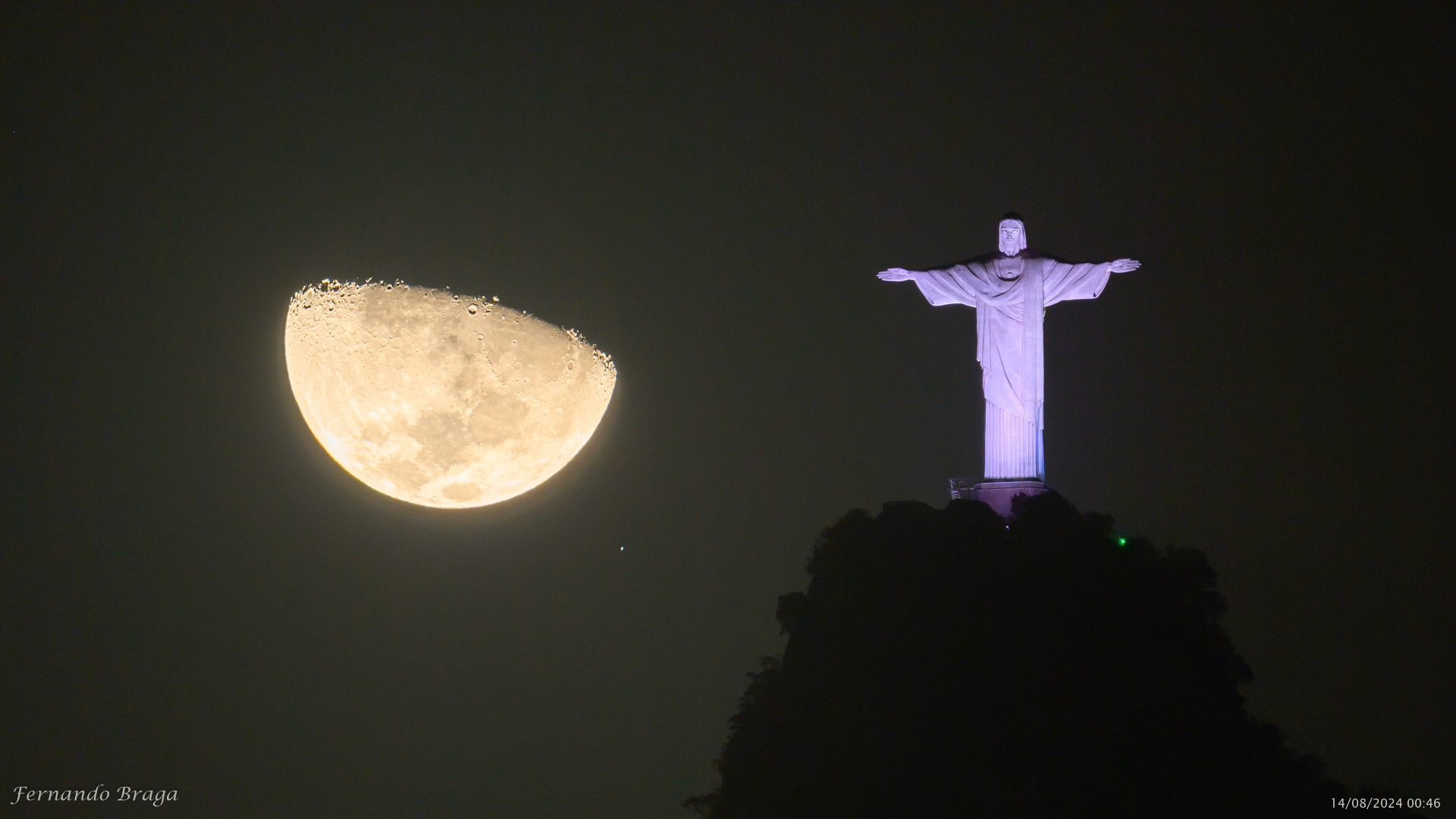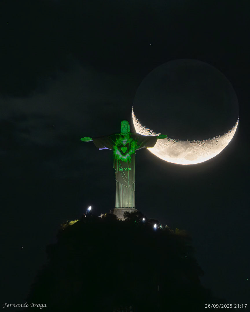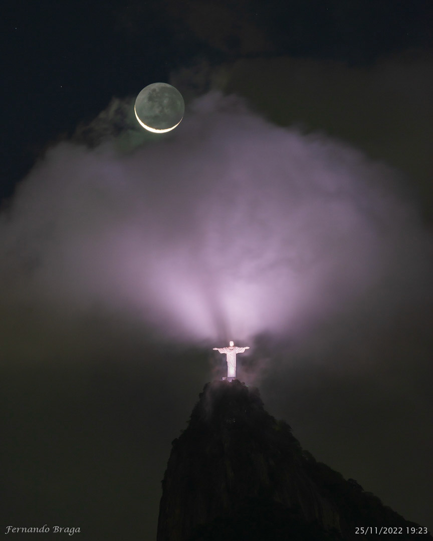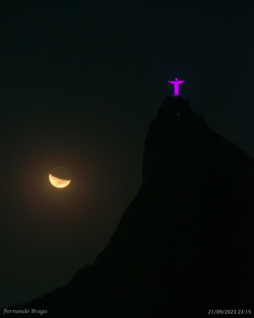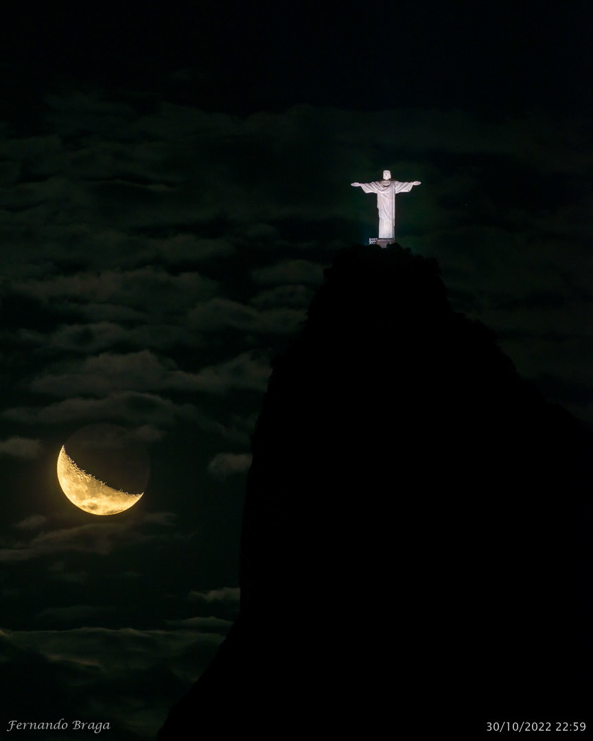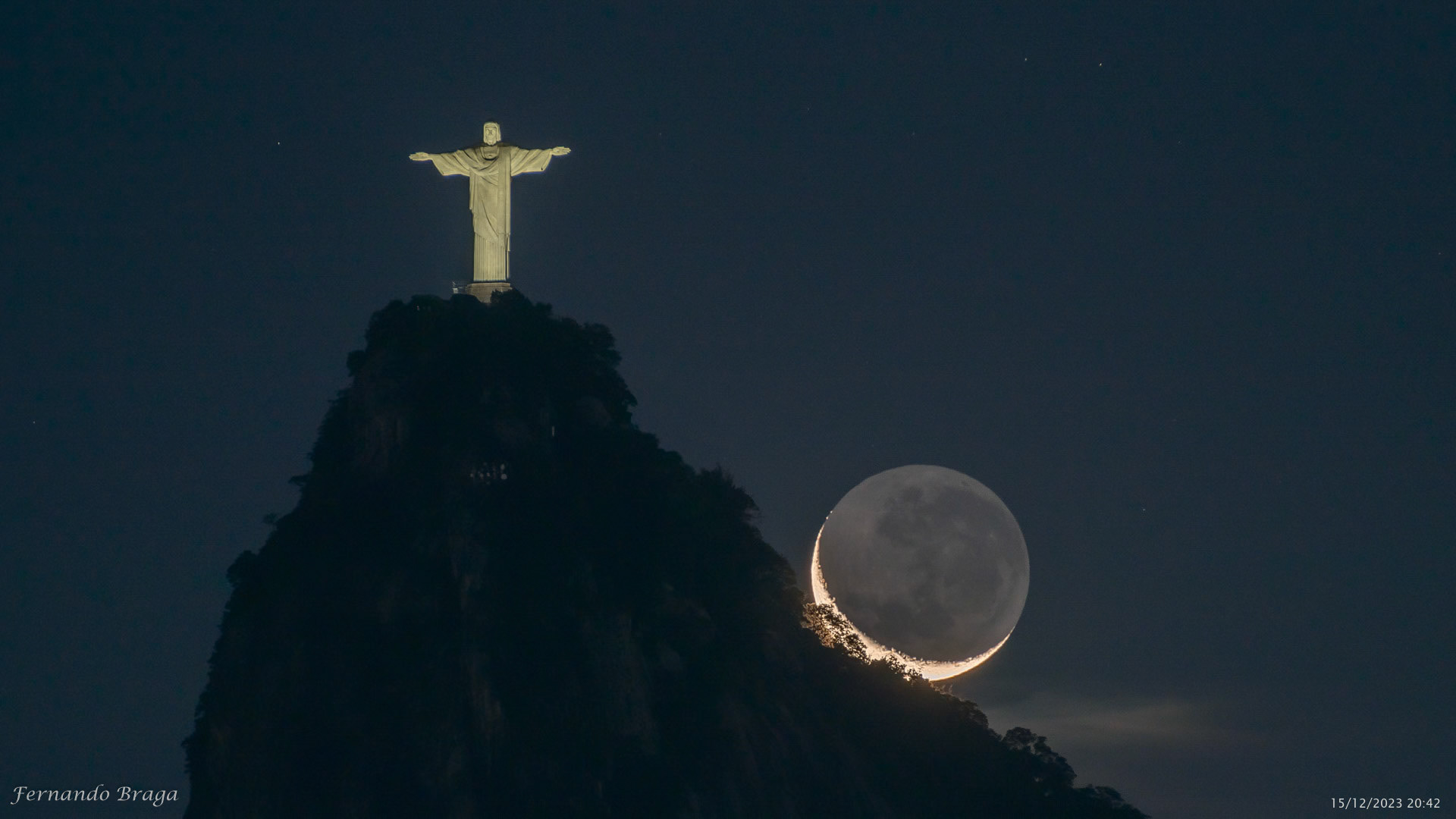 Um encontro celestial entre o planeta Vênus, a Lua Crescente e o Cristo Redentor.