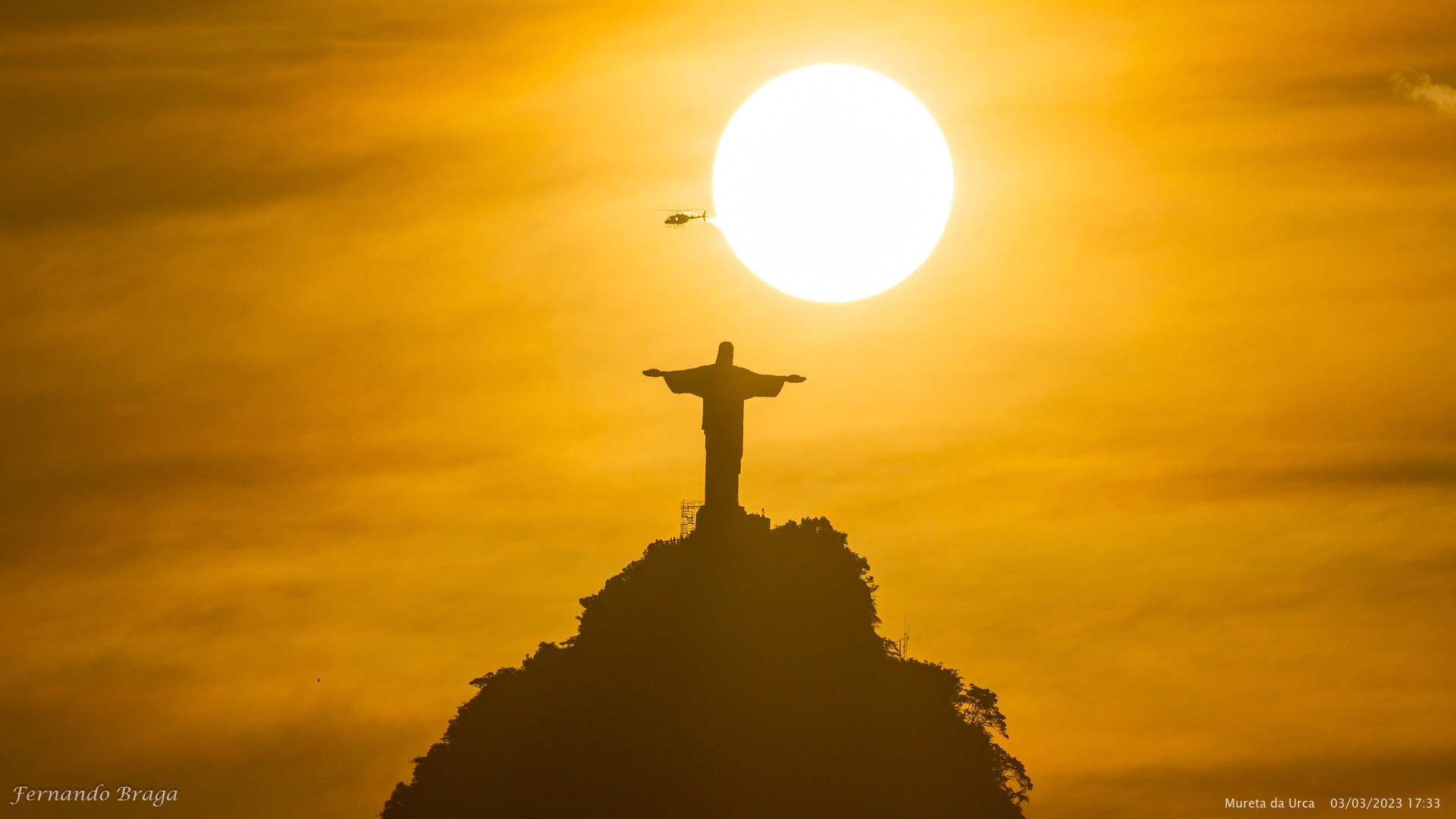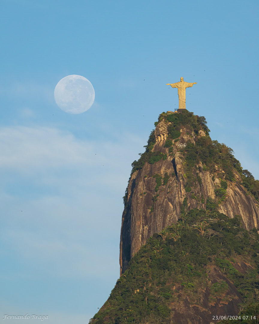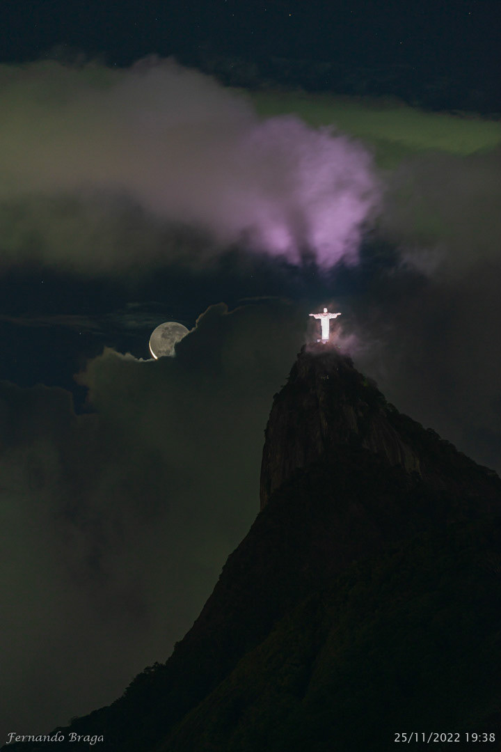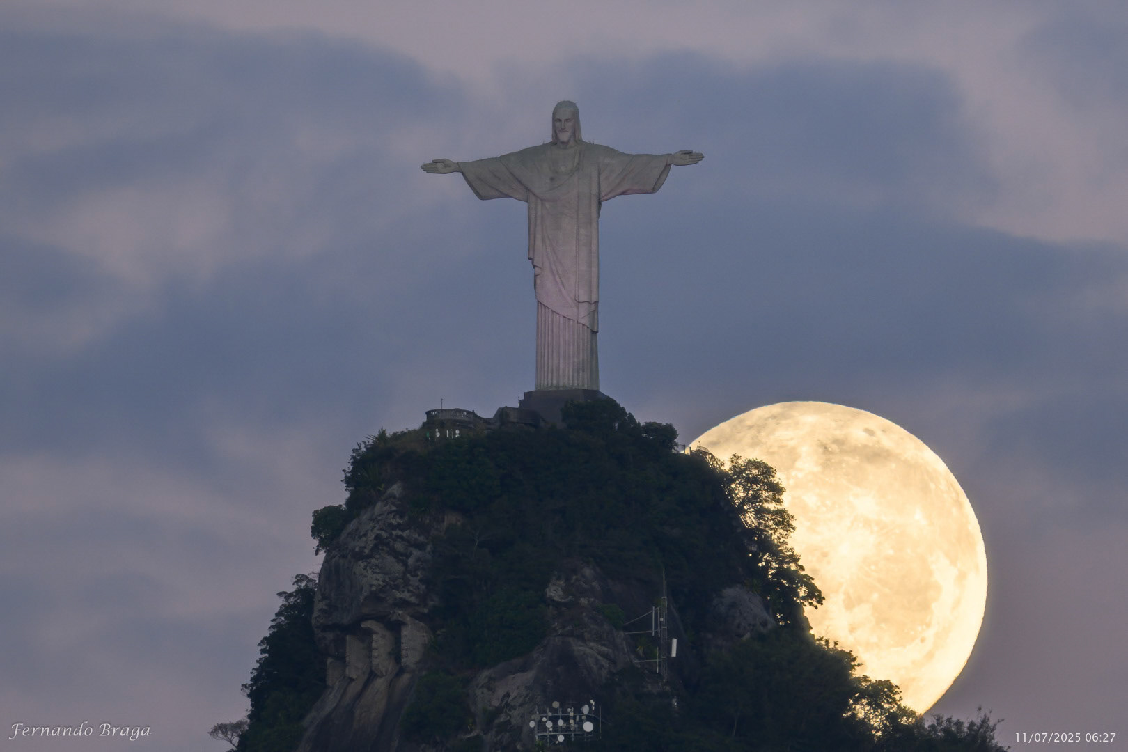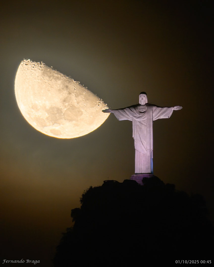 Um encontro celestial entre o planeta Vênus, a Lua Crescente e o Cristo Redentor.