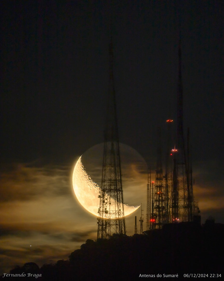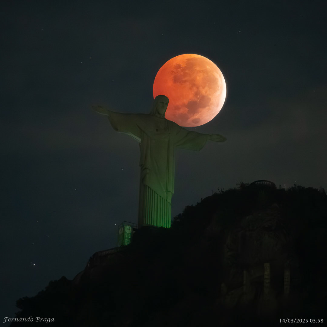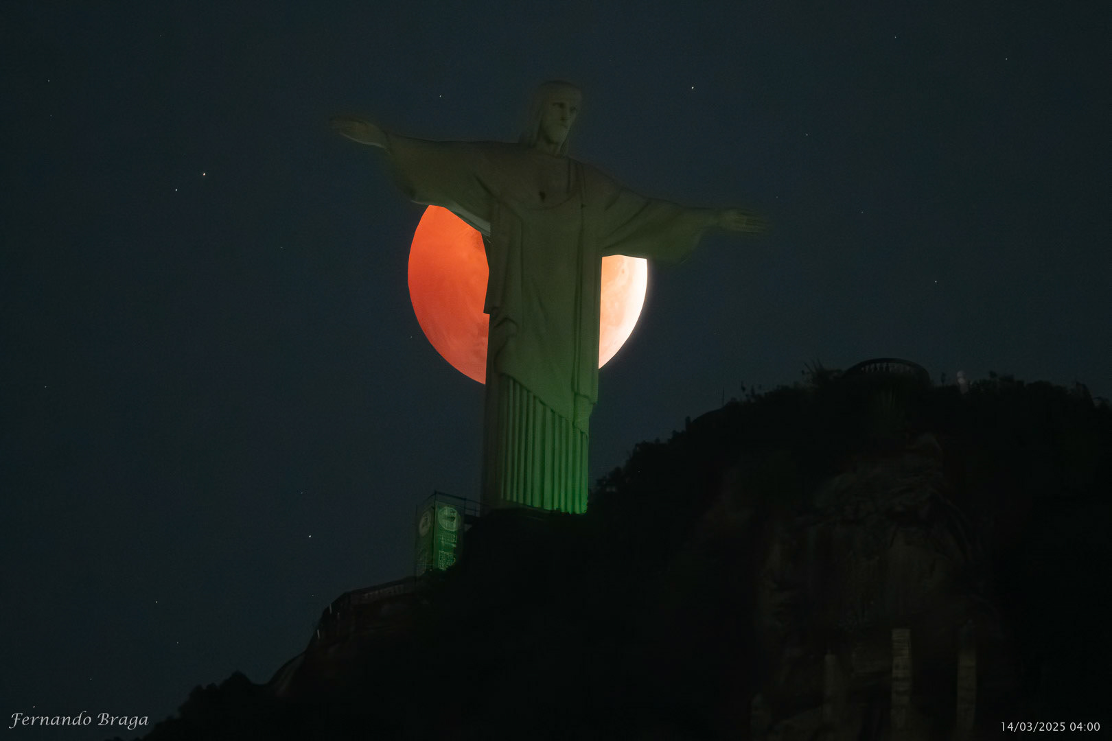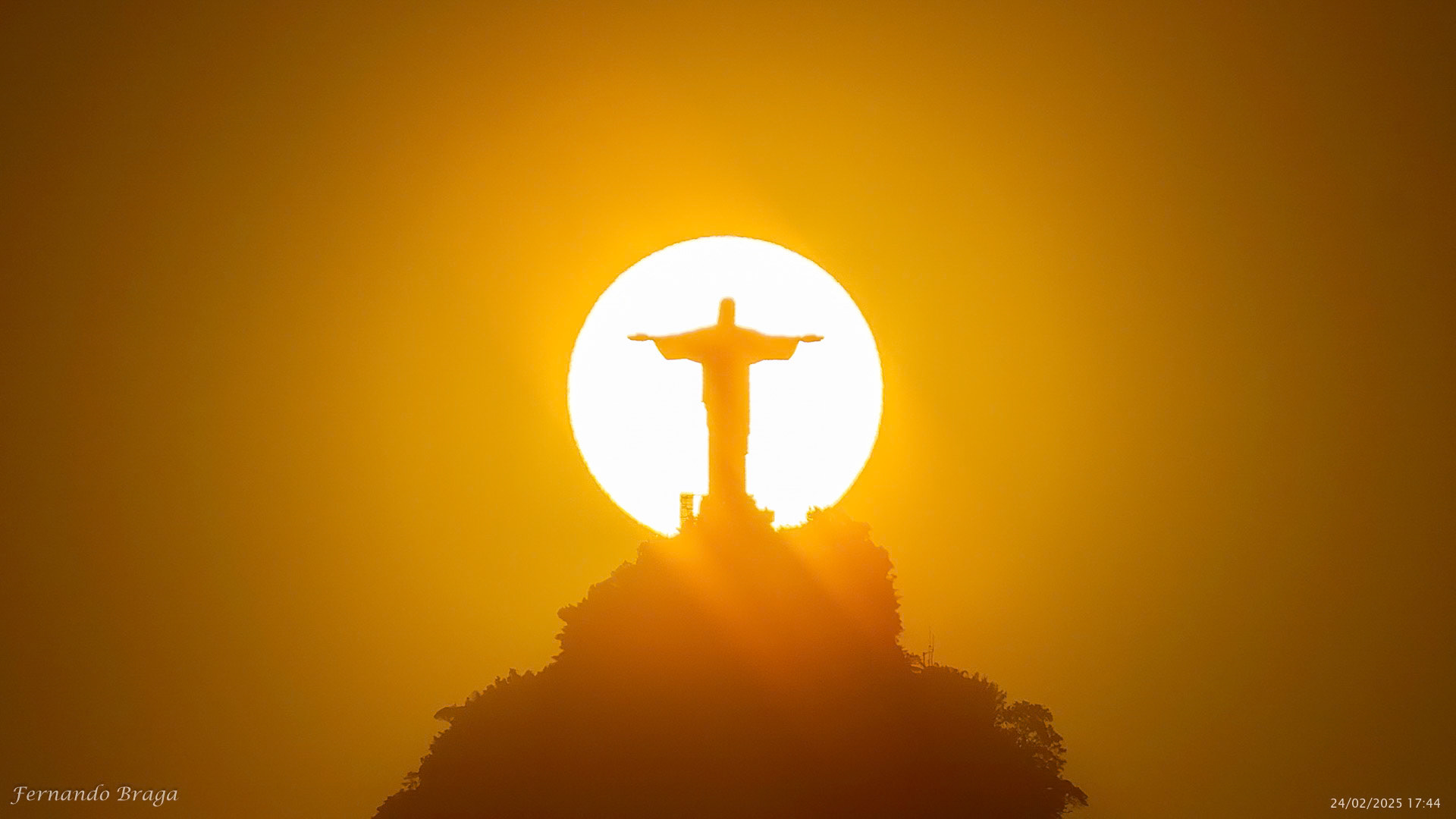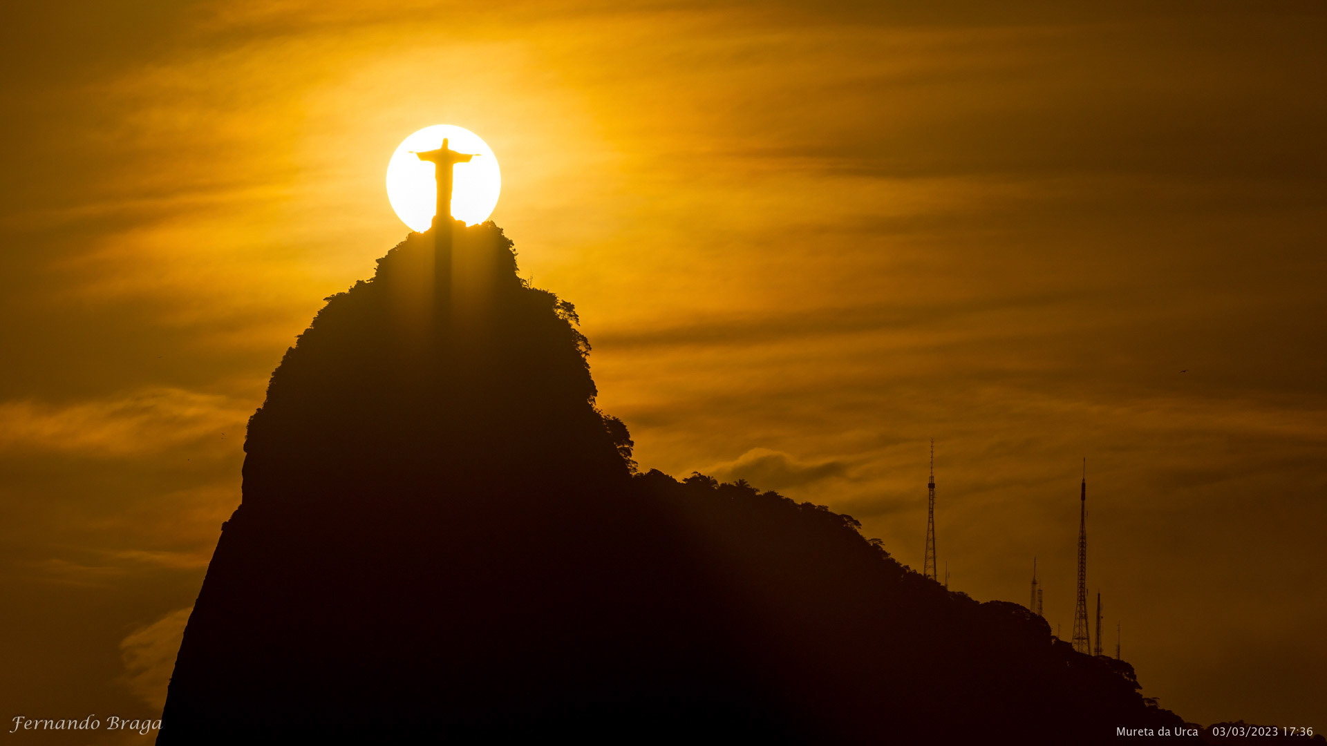 Um encontro celestial entre o planeta Vênus, a Lua Crescente e o Cristo Redentor.