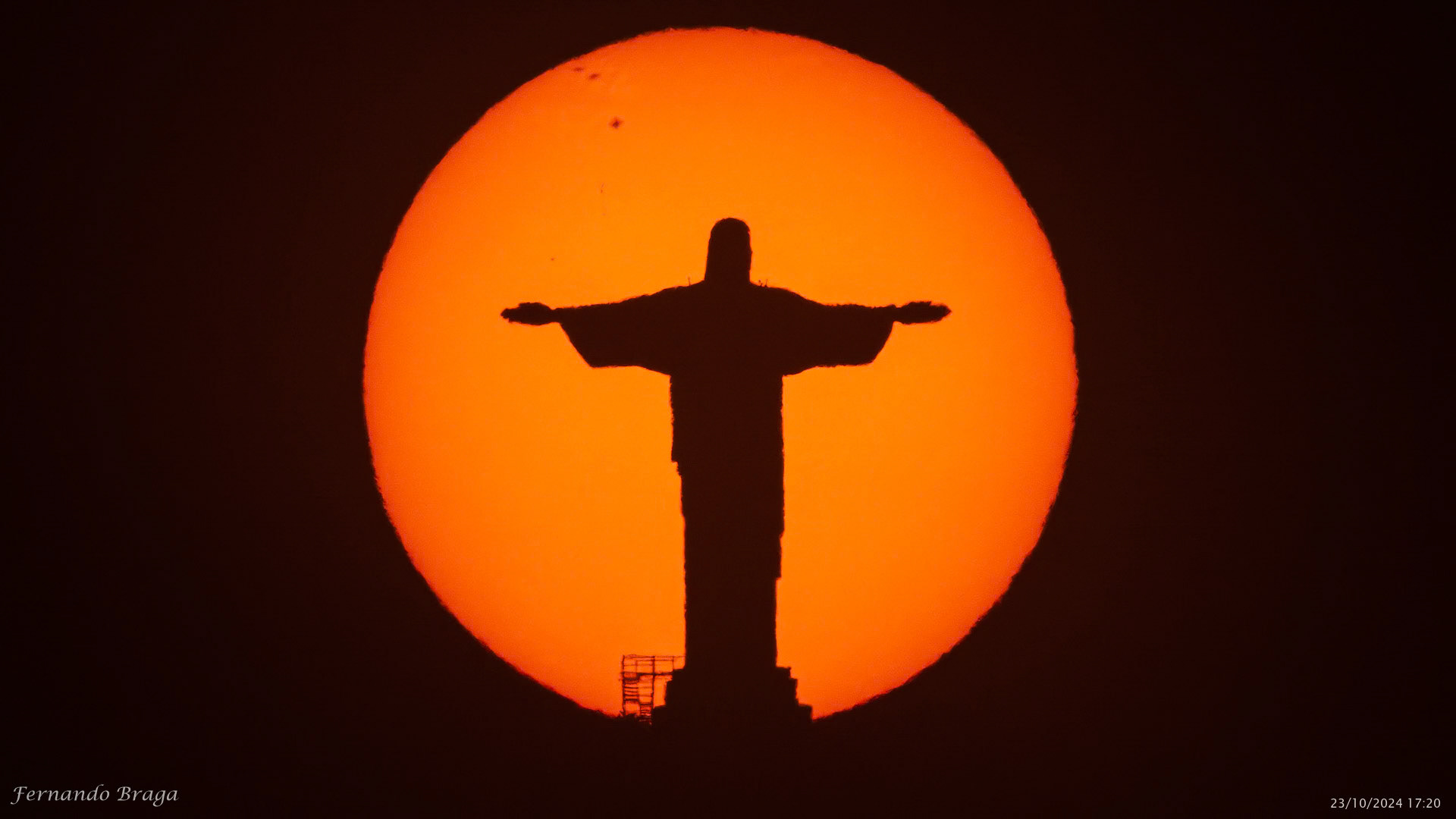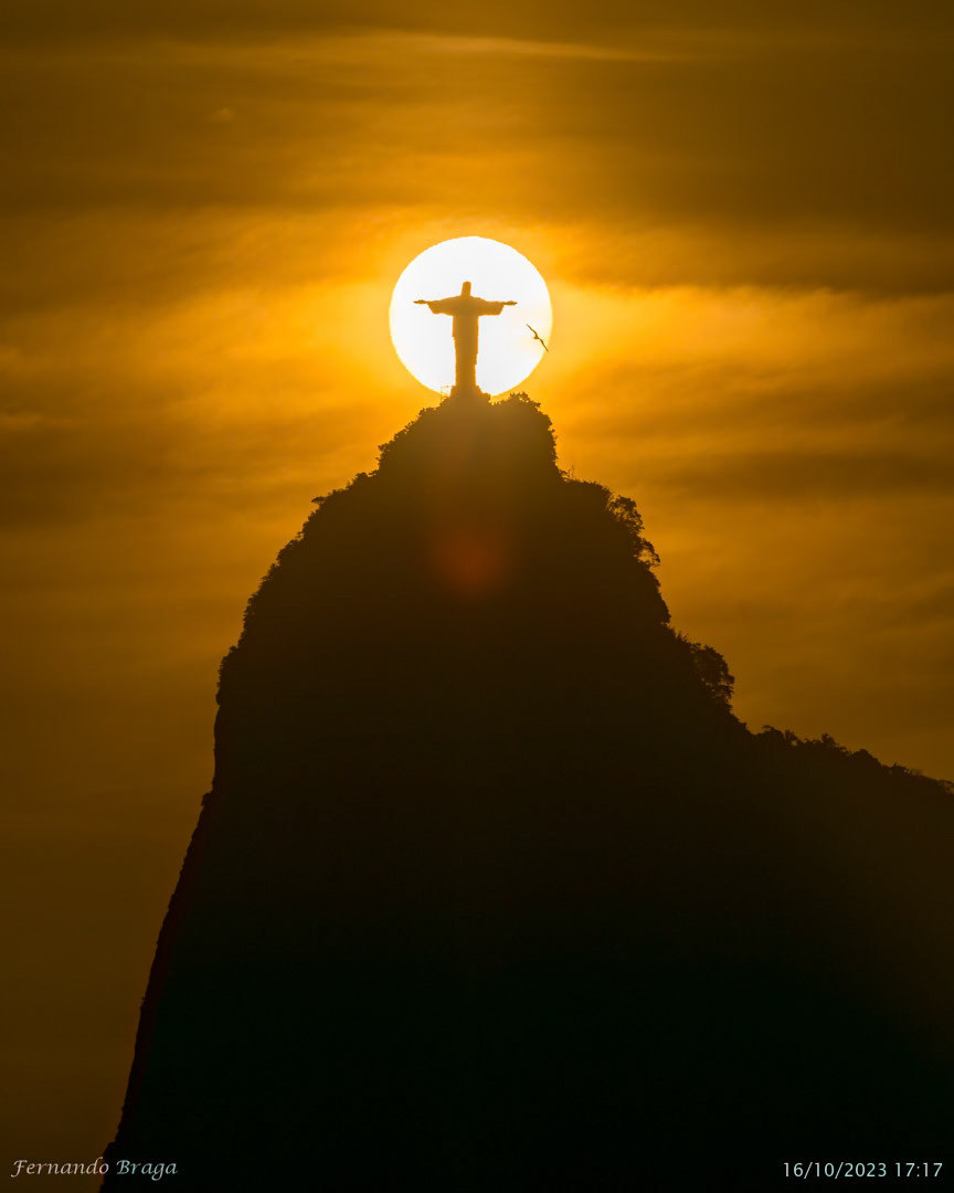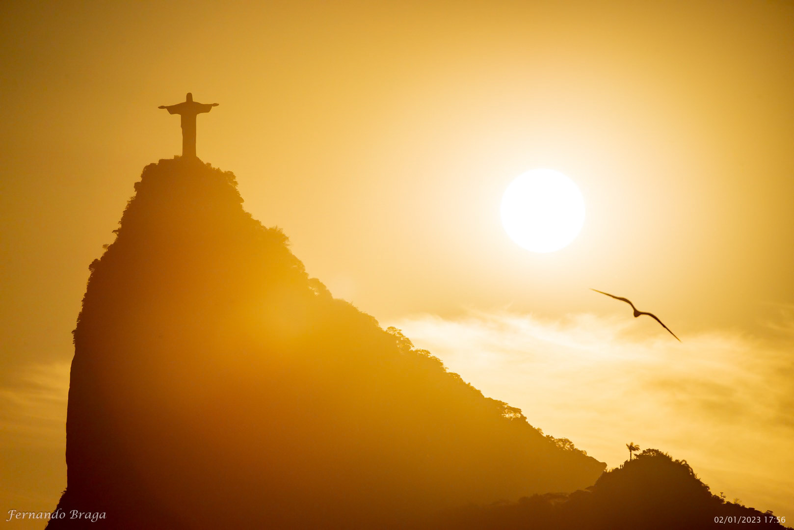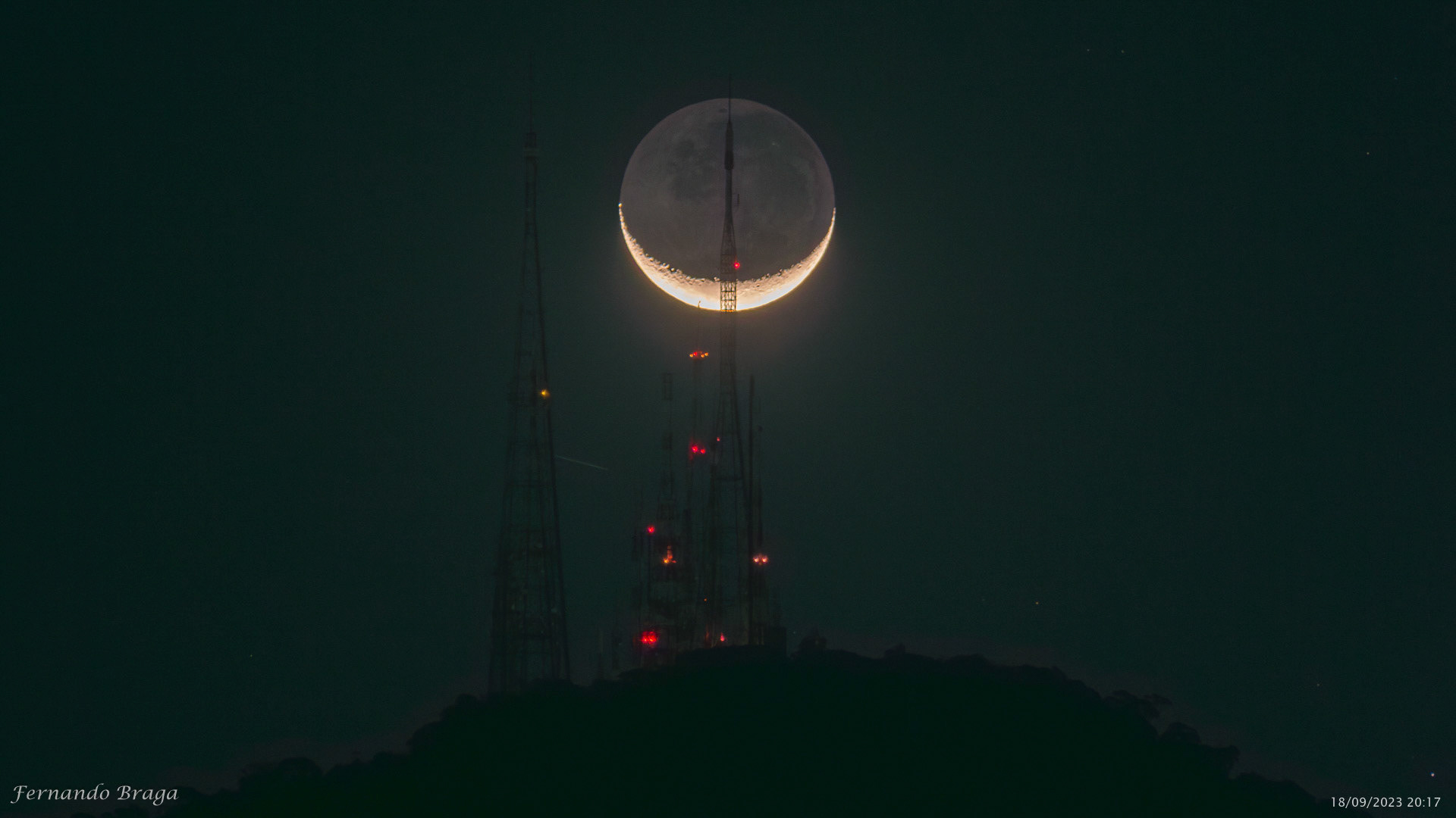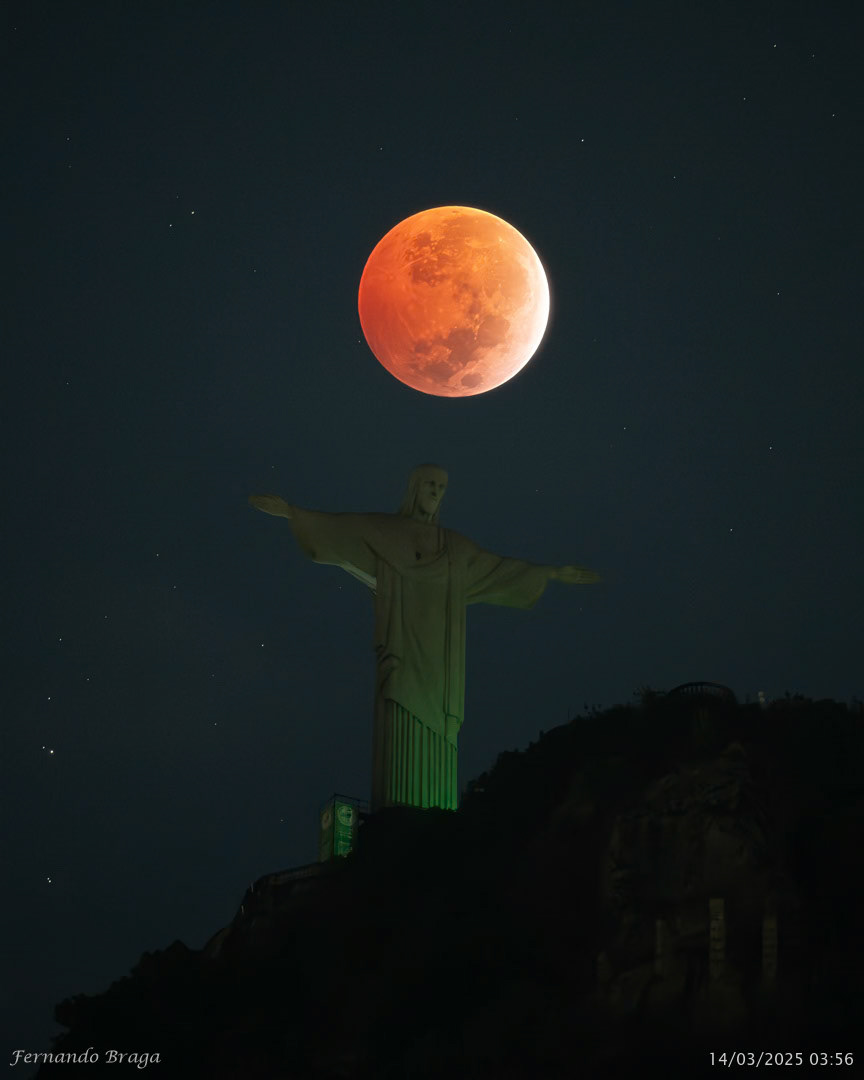 Um encontro celestial entre o planeta Vênus, a Lua Crescente e o Cristo Redentor.