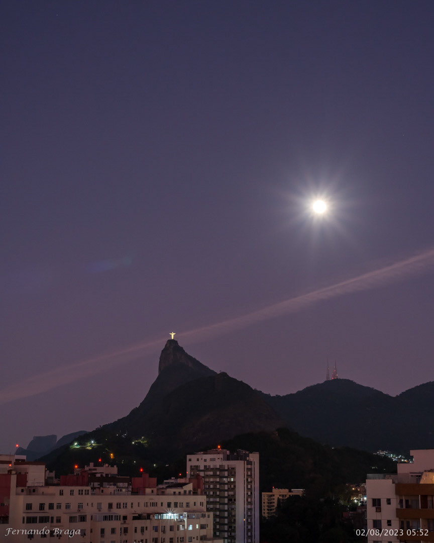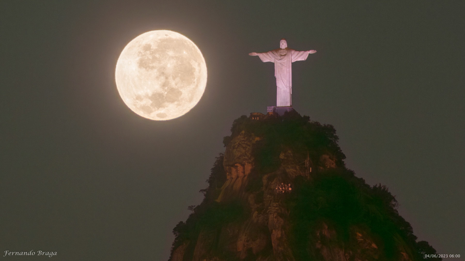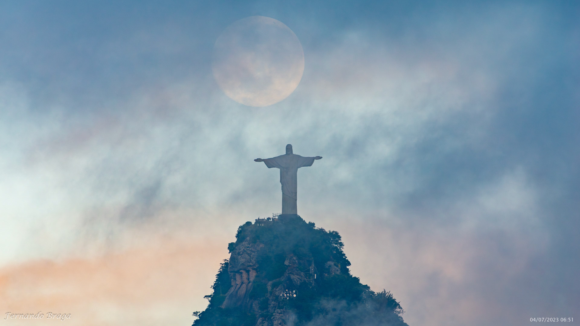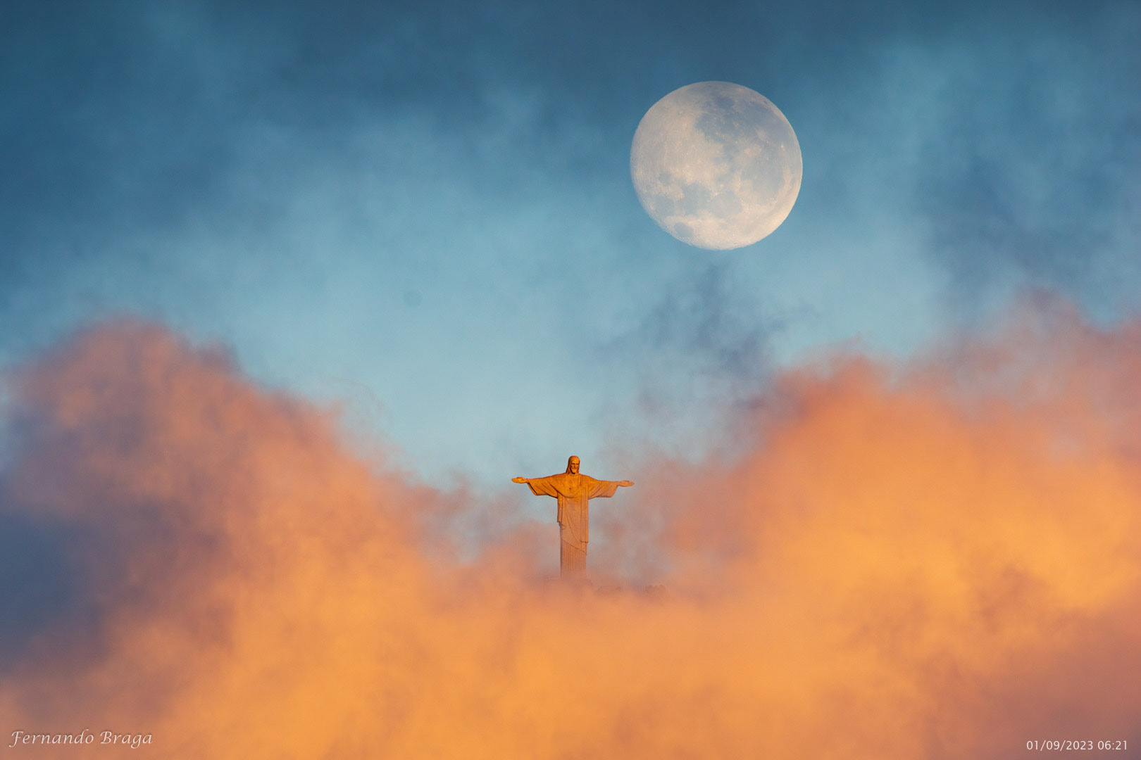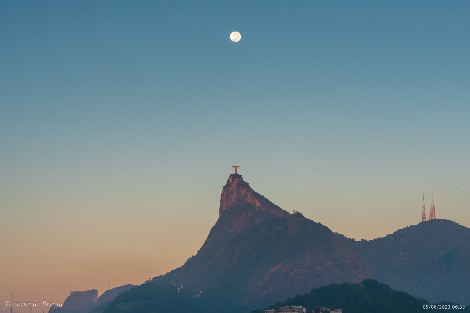 Encontro da última super lua de 2021 cravando seu centro na cabeça do Cristo Redentor ao nascer do sol, registrada da minha casa no bairro do Flamengo, Rio de Janeiro/RJ, Brasil.