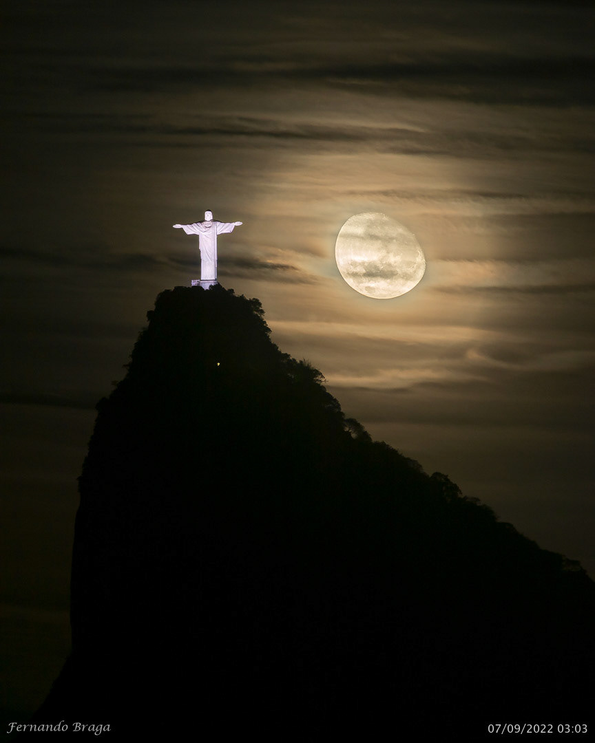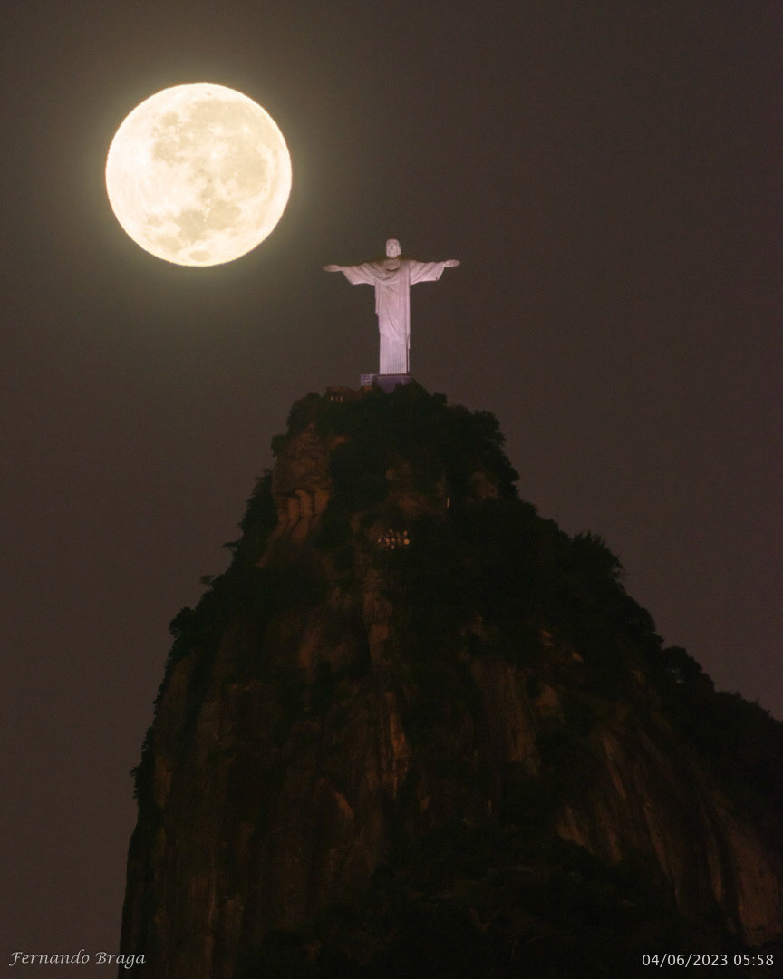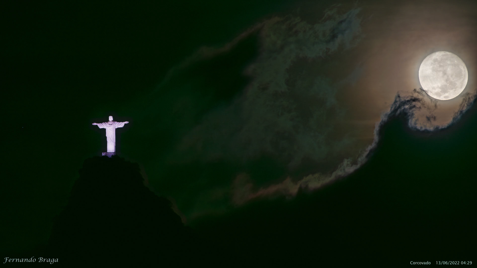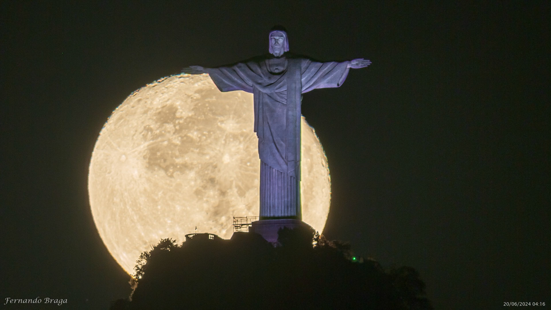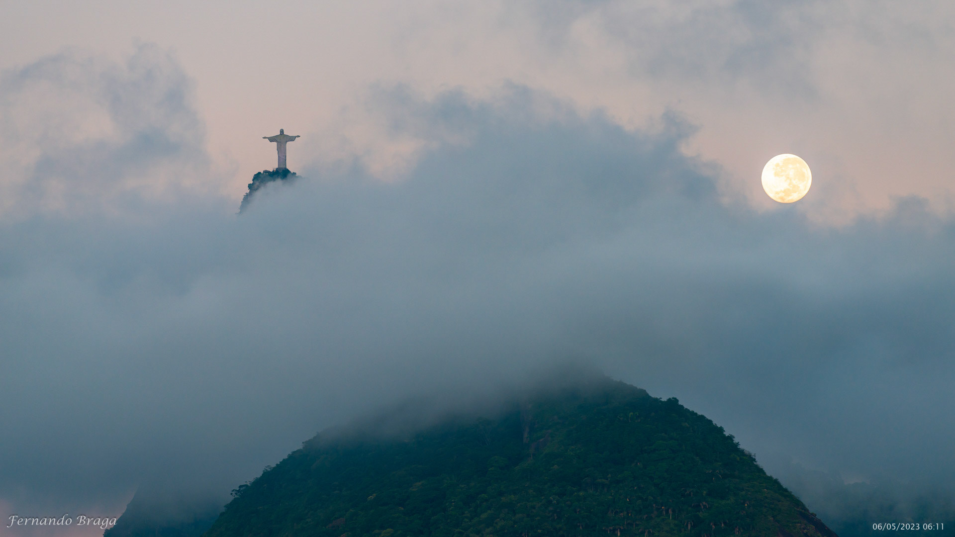 Encontro da última super lua de 2021 cravando seu centro na cabeça do Cristo Redentor ao nascer do sol, registrada da minha casa no bairro do Flamengo, Rio de Janeiro/RJ, Brasil.