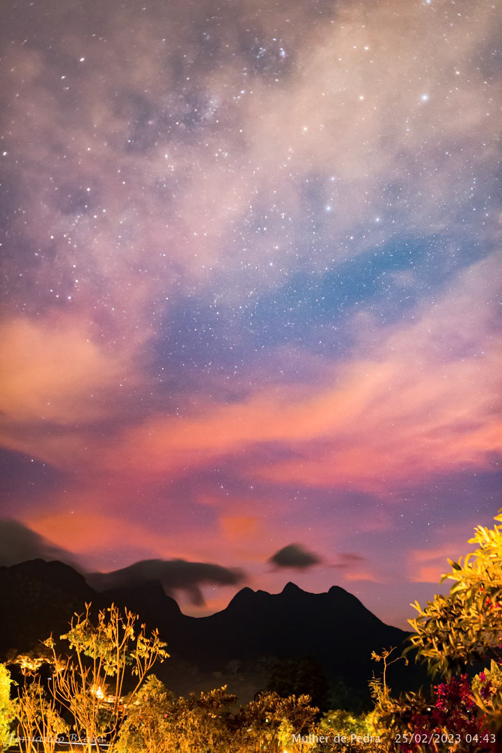 A Via Láctea se despedindo da Mulher de Pedra durante o Céu Vulcânico no crepúsculo em Vargem Grande, Teresópolis/RJ