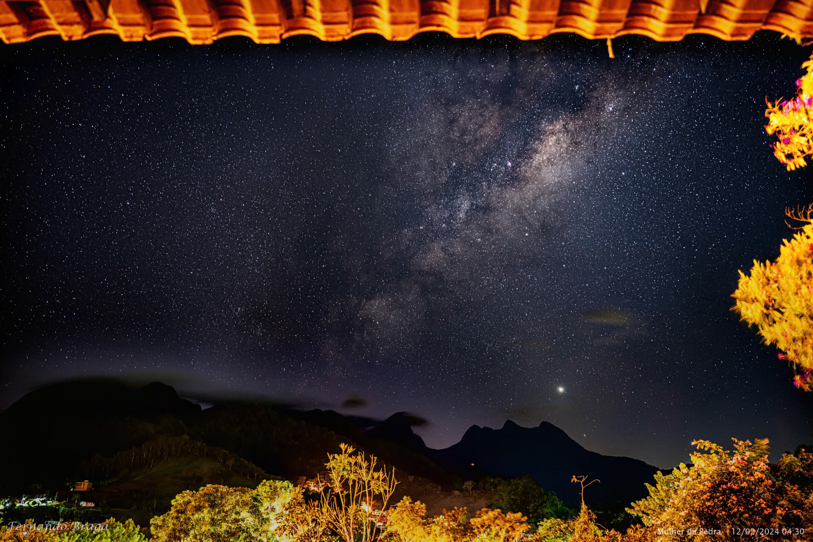 A Via Láctea sob a Mulher de Pedra vista da varanda de casa em Vargem Grande, Teresópolis/RJ
