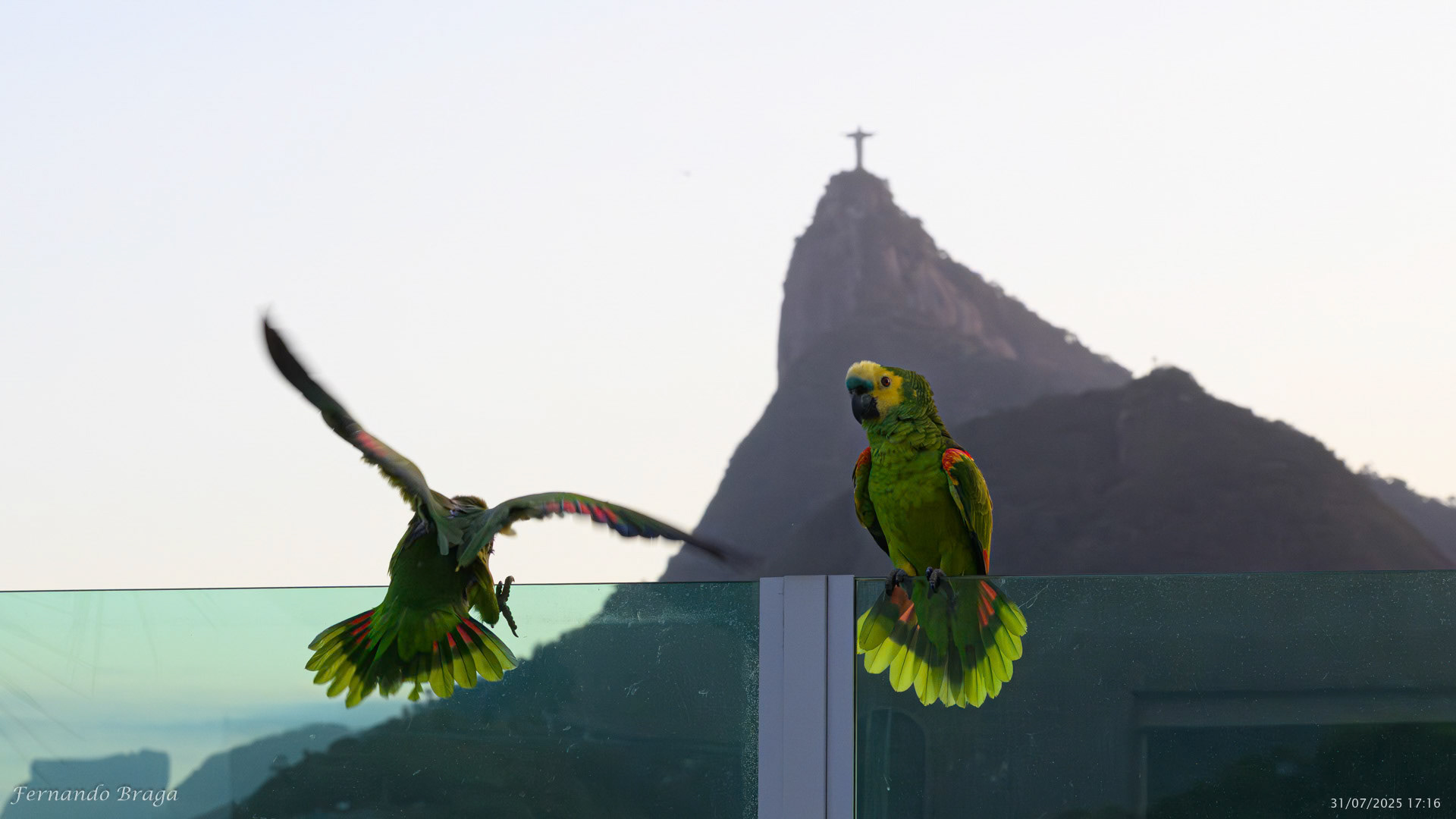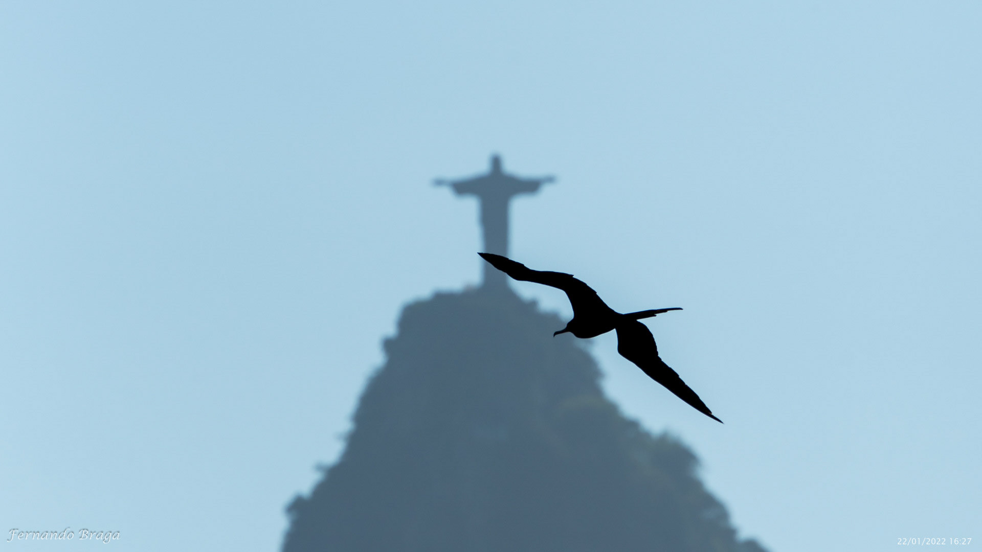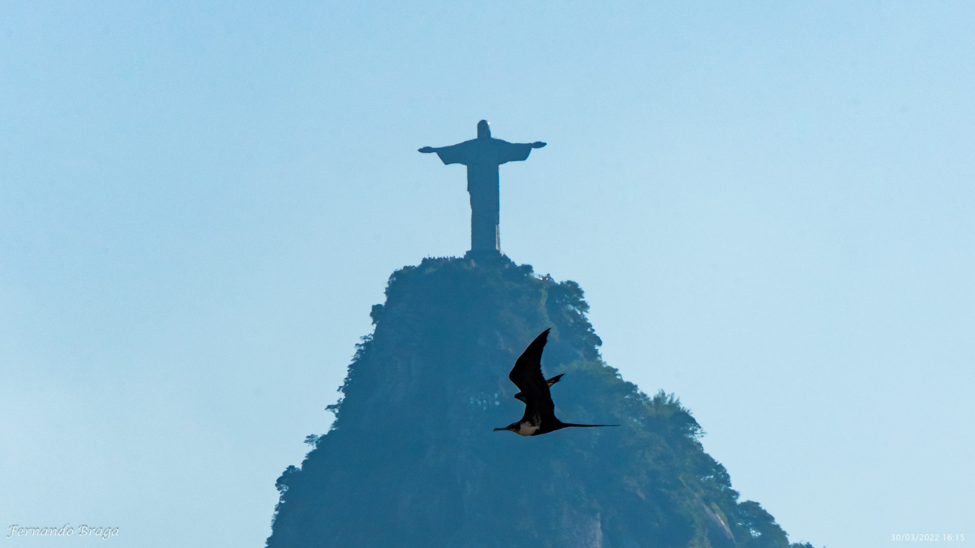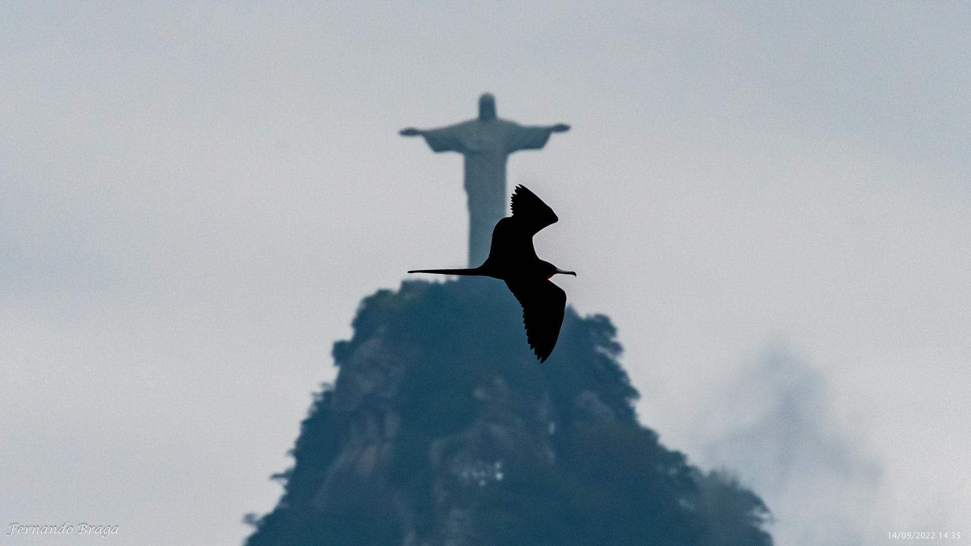 Uma fragata voando sob os braços do Cristo Redentor no final de tarde.